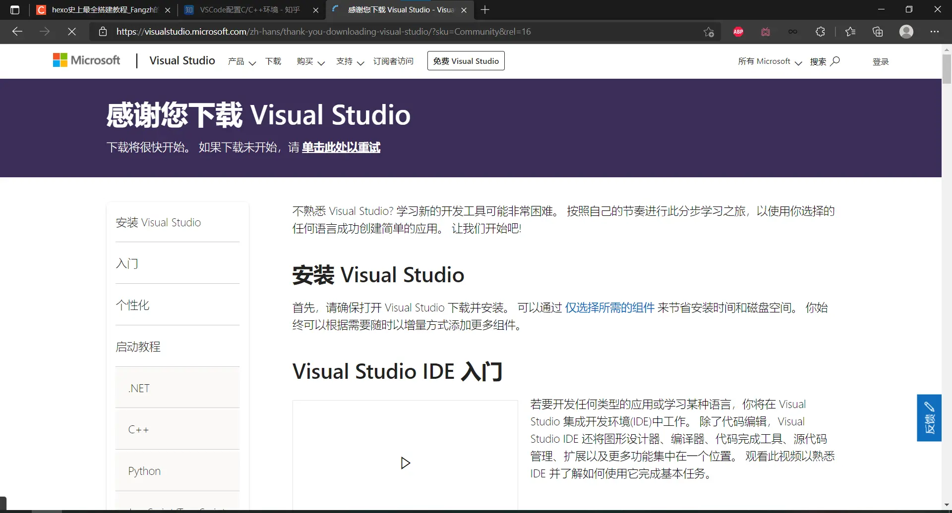 我立刻卸载了电脑上的vs2017和Visual Studio Installer,再次前往vs的官网,这次我前检查后检查,确定自己下载的是Visual Studio 2019的Community版本,在单击了下载链接之后,我又跳转到了感谢下载的界面。