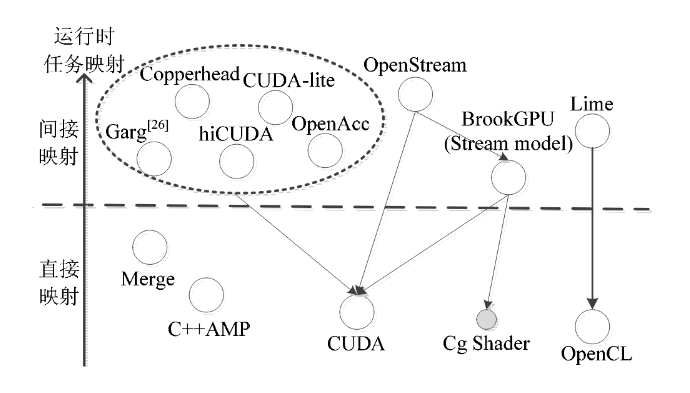 异构编程/运行时系统的任务映射机制主要有两种:一类是直接映射,即独立完成并行任务向异构平台映射的工作,另一种是间接映射,即需要借助其他异构编译和运行时系统协助来完成部分任务映射工作。直接映射系统一般在运行时系统中实现,而间接映射通过源到源变换和是运行时分析相结合的方式实现。